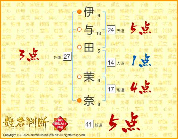 伊与田茉奈さんの総運は41画の5点!