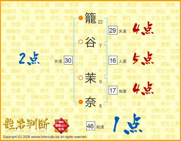 籠(22画)谷(7画) 茉(9画)奈(8画)