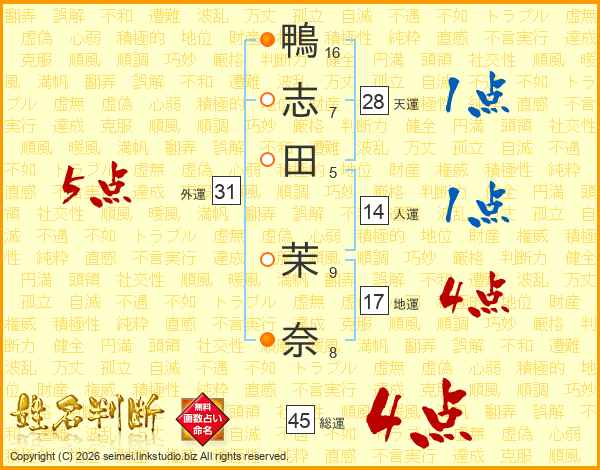 鴨(16画)志(7画)田(5画) 茉(9画)奈(8画)