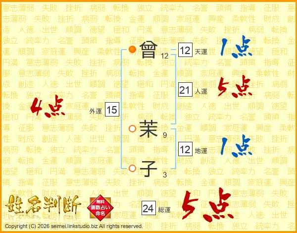 家系が持つ宿命的な運勢を表します。祖先から受け継いだ苗字ですので自分の力が及びません。家柄を象徴します。苗字の合計画数。