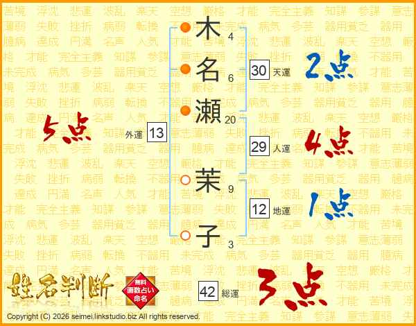 木(4画)名(6画)瀬(20画) 茉(9画)子(3画)