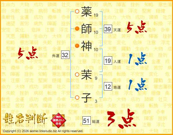 薬(19画)師(10画)神(10画) 茉(9画)子(3画)