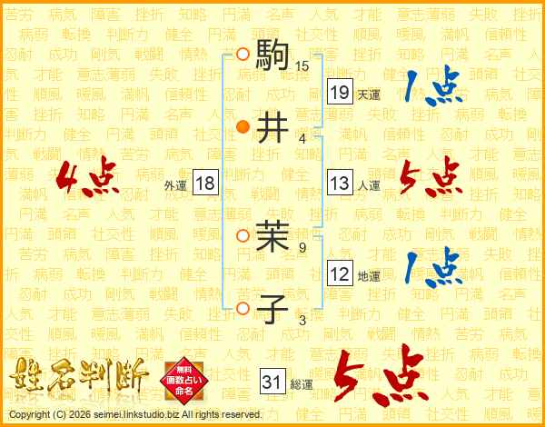 生活面を象徴する運勢です。外部から受ける影響力を表し、結婚運、家庭運や職場、環境への順応性を表します。総運から人運を引いた画数。姓や名が1文字の場合を除く。