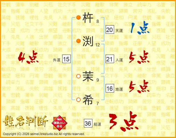 杵(8画)渕(12画) 茉(9画)希(7画)