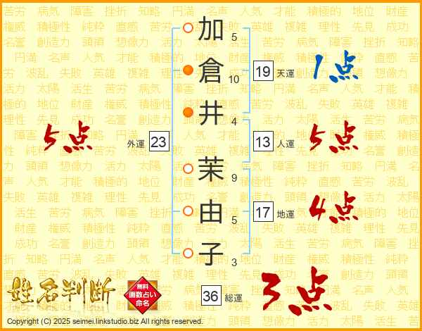 加(5画)倉(10画)井(4画) 茉(9画)由(5画)子(3画)