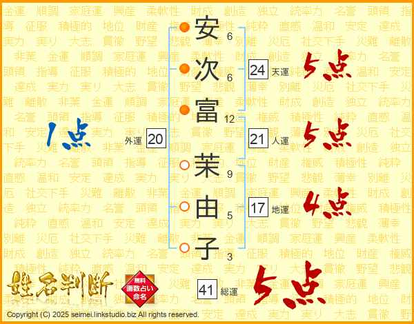 安(6画)次(6画)富(12画) 茉(9画)由(5画)子(3画)