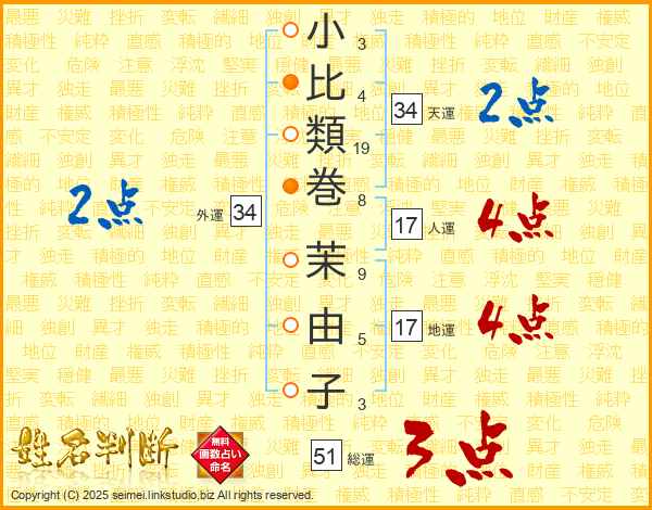 小(3画)比(4画)類(19画)巻(8画) 茉(9画)由(5画)子(3画)