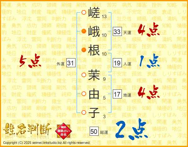嵯(13画)峨(10画)根(10画) 茉(9画)由(5画)子(3画)