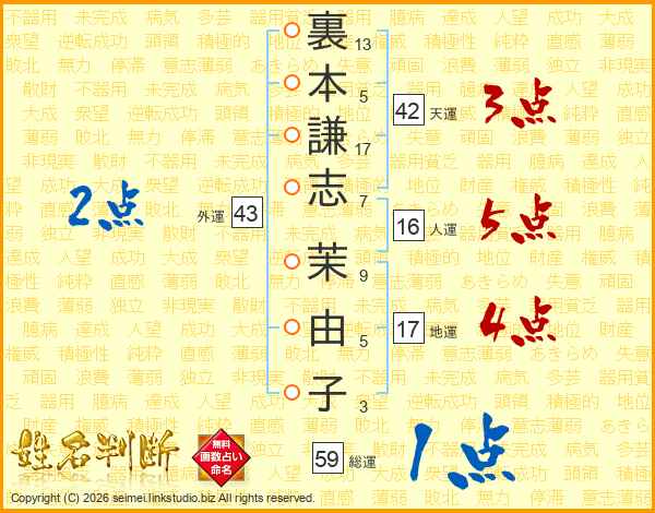 裏本謙志茉由子さんの総運は59画の1点!