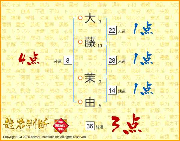 生活面を象徴する運勢です。外部から受ける影響力を表し、結婚運、家庭運や職場、環境への順応性を表します。総運から人運を引いた画数。姓や名が1文字の場合を除く。