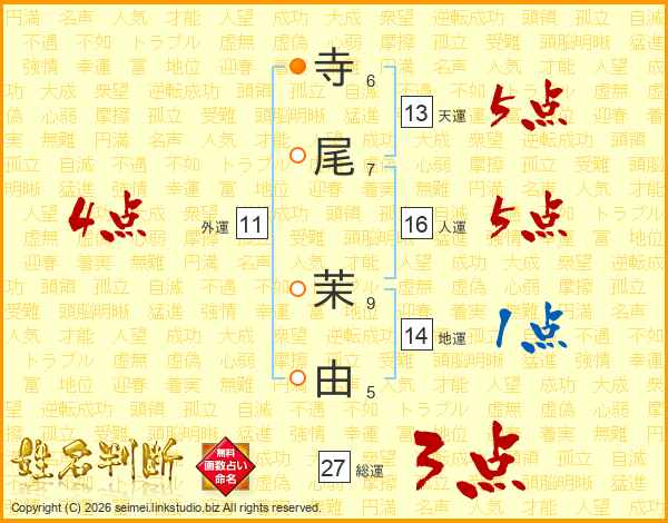 寺(6画)尾(7画) 茉(9画)由(5画)