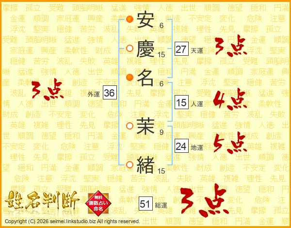 安(6画)慶(15画)名(6画) 茉(9画)緒(15画)
