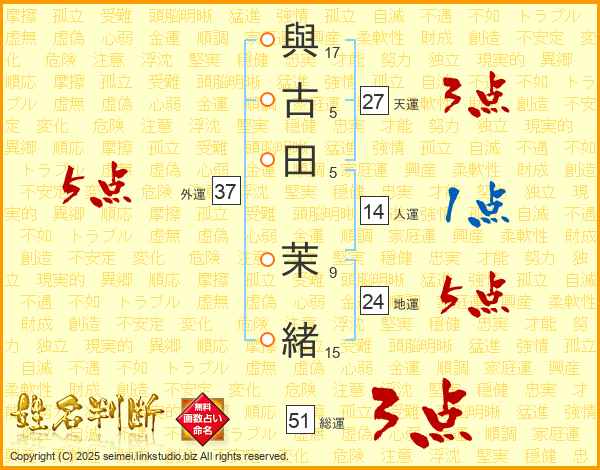與(17画)古(5画)田(5画) 茉(9画)緒(15画)
