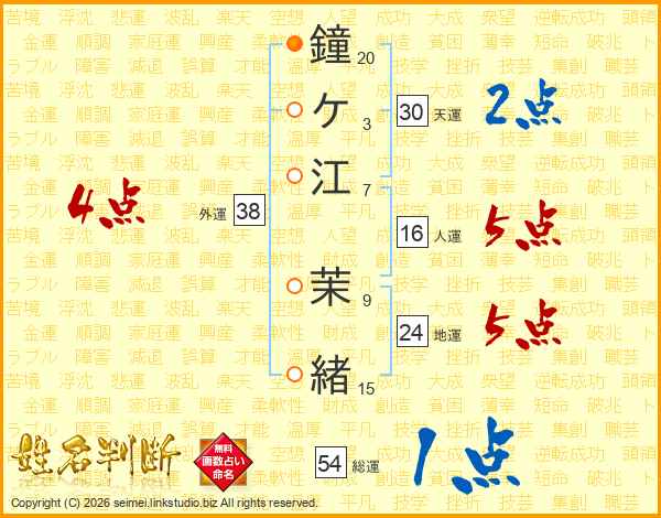 鐘ケ江茉緒さんの外運は38画の4点!