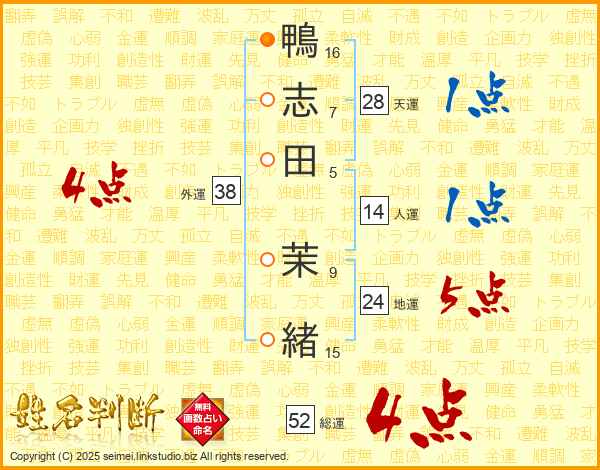 鴨(16画)志(7画)田(5画) 茉(9画)緒(15画)