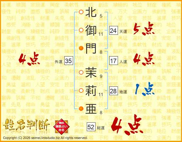 北御門茉莉亜さんの総運は52画の4点!