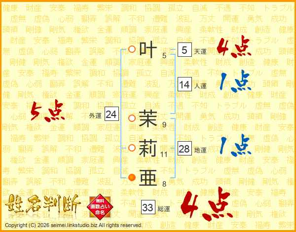 叶茉莉亜さんの総運は33画の4点!