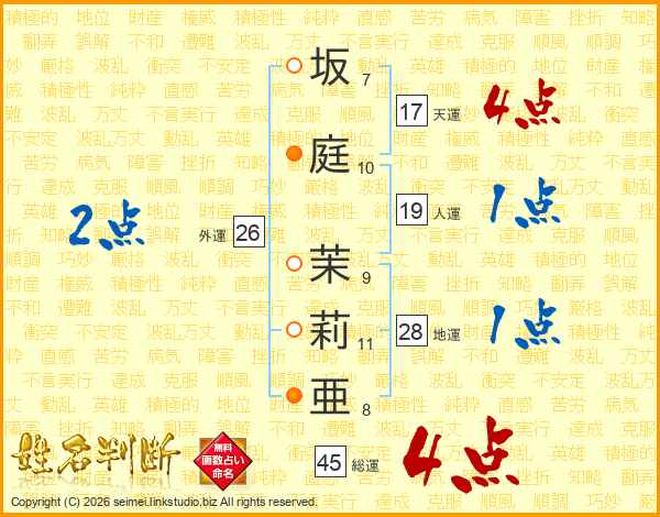 坂庭茉莉亜さんの総運は45画の4点!