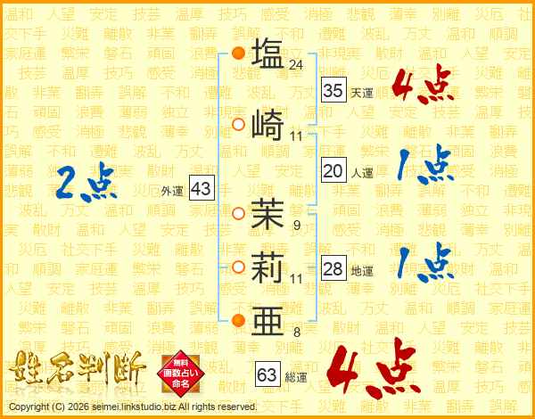 塩(24画)崎(11画) 茉(9画)莉(11画)亜(8画)
