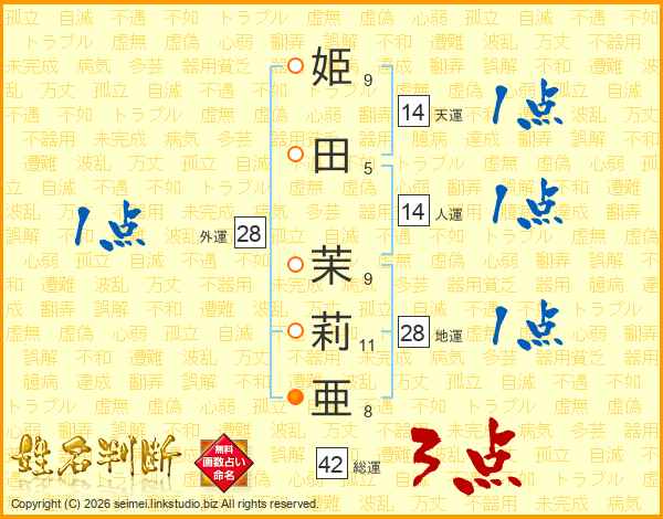 姫田茉莉亜さんの総運は42画の3点!