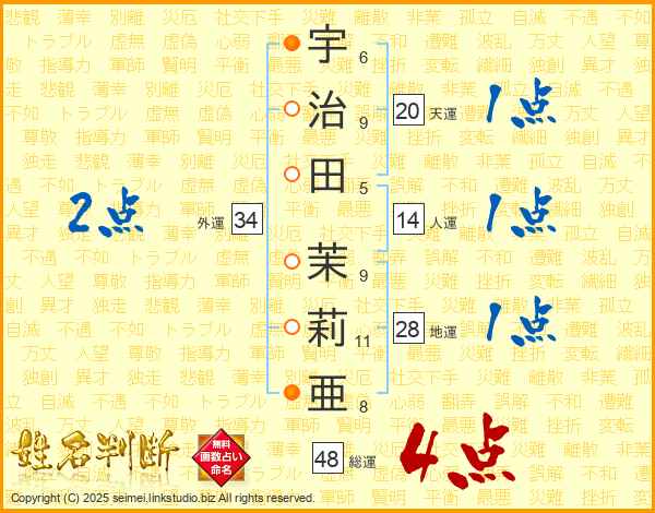 宇治田茉莉亜さんの総運は48画の4点!