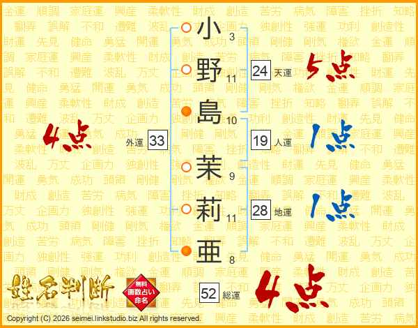 小(3画)野(11画)島(10画) 茉(9画)莉(11画)亜(8画)