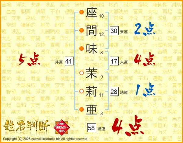 座(10画)間(12画)味(8画) 茉(9画)莉(11画)亜(8画)