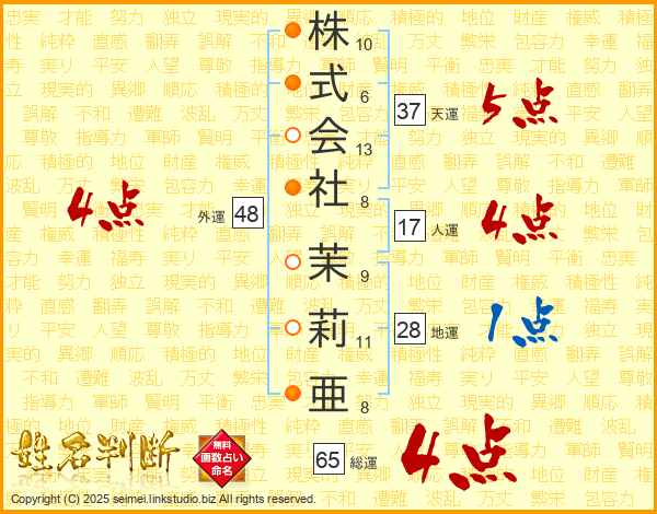 株(10画)式(6画)会(13画)社(8画) 茉(9画)莉(11画)亜(8画)