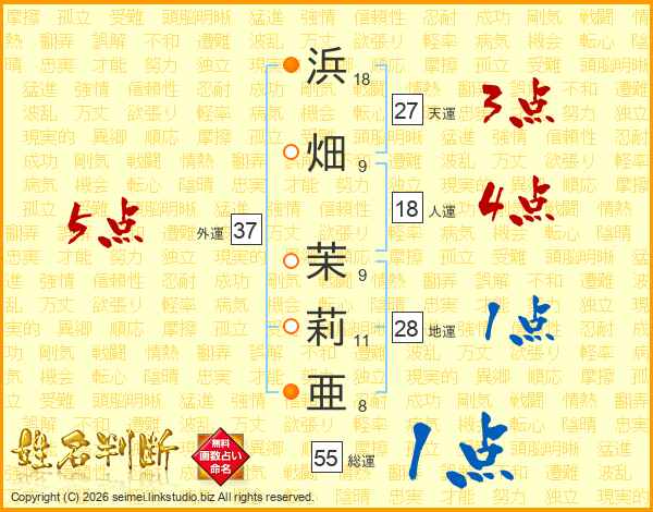 浜(18画)畑(9画) 茉(9画)莉(11画)亜(8画)
