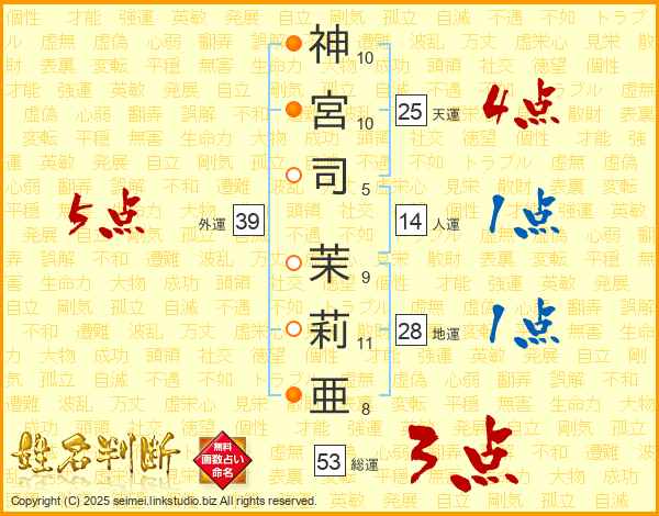 神(10画)宮(10画)司(5画) 茉(9画)莉(11画)亜(8画)