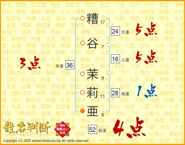 糟谷茉莉亜さんの総運は52画の4点!