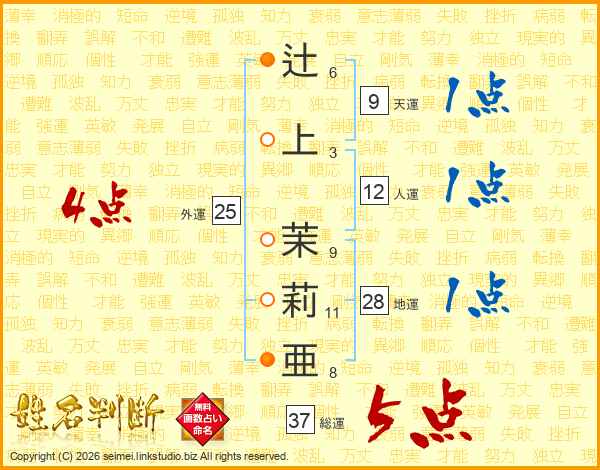 辻上茉莉亜さんの総運は37画の5点!