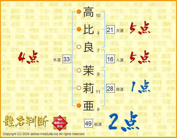 高(10画)比(4画)良(7画) 茉(9画)莉(11画)亜(8画)