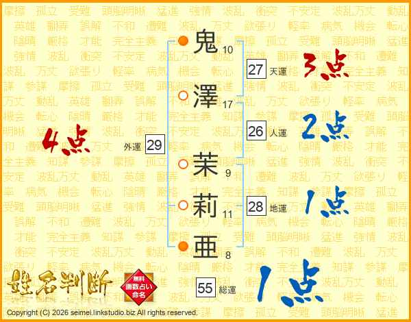 鬼澤茉莉亜さんの総運は55画の1点!
