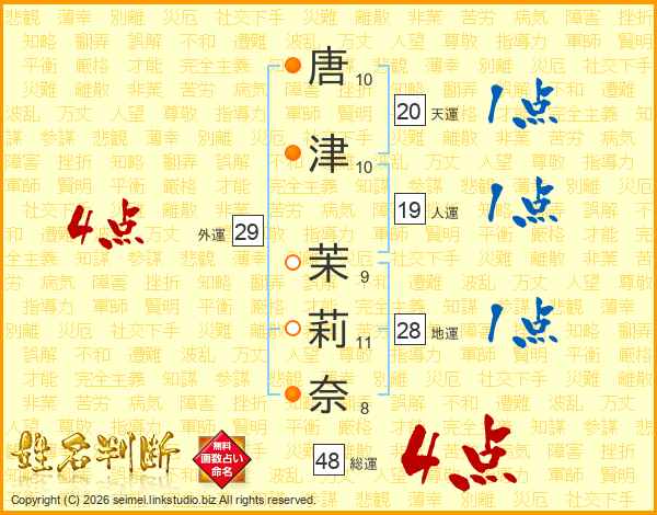 唐(10画)津(10画) 茉(9画)莉(11画)奈(8画)
