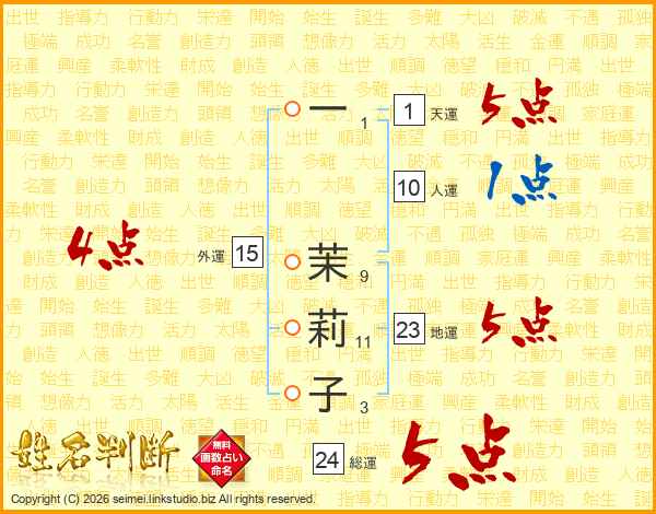 生活面を象徴する運勢です。外部から受ける影響力を表し、結婚運、家庭運や職場、環境への順応性を表します。総運から人運を引いた画数。姓や名が1文字の場合を除く。