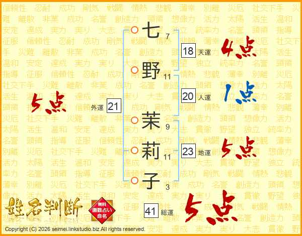 七野茉莉子さんの総運は41画の5点!
