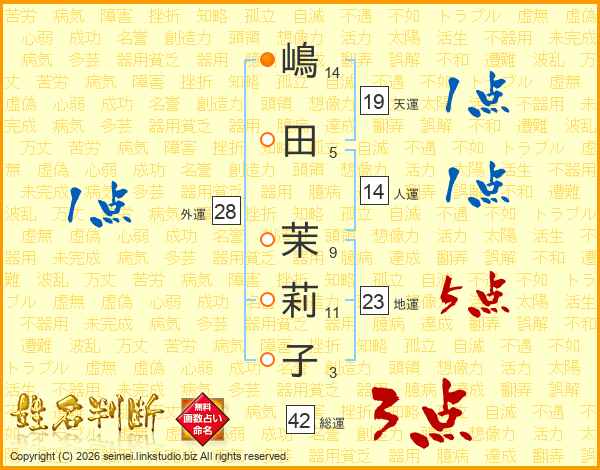 嶋田茉莉子さんの総運は42画の3点!