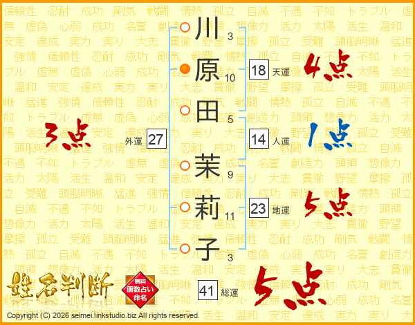 川(3画)原(10画)田(5画) 茉(9画)莉(11画)子(3画)