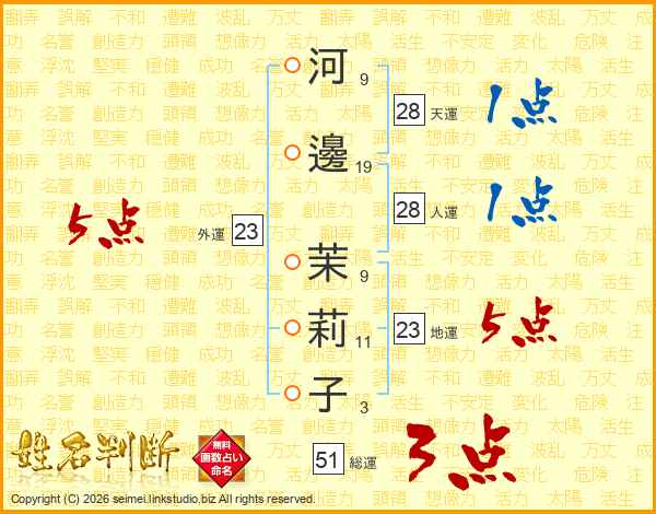 河邊茉莉子さんの総運は51画の3点!