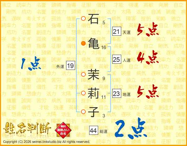 石(5画)亀(16画) 茉(9画)莉(11画)子(3画)