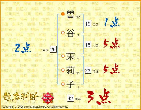 曽(12画)谷(7画) 茉(9画)莉(11画)子(3画)