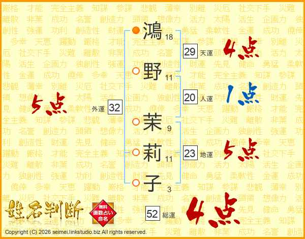 鴻野茉莉子さんの総運は52画の4点!