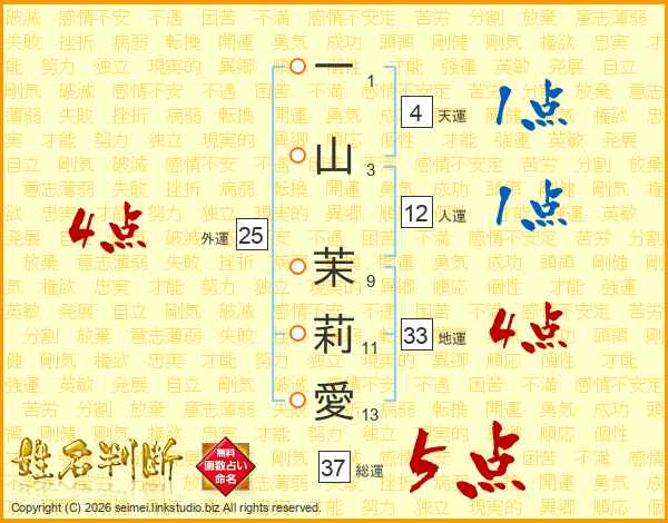 一(1画)山(3画) 茉(9画)莉(11画)愛(13画)