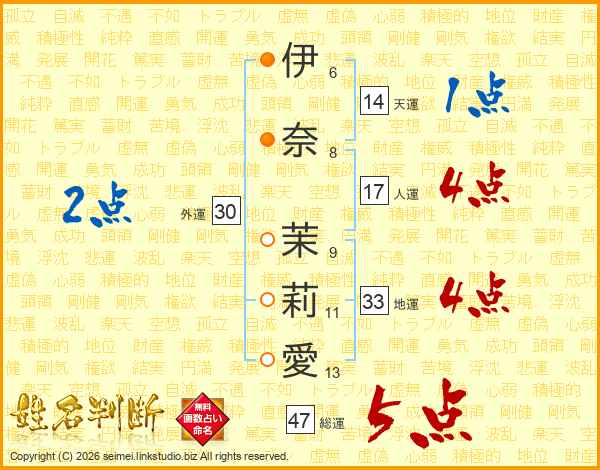 伊(6画)奈(8画) 茉(9画)莉(11画)愛(13画)