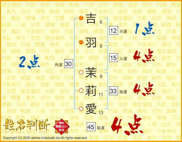 吉羽茉莉愛さんの総運は45画の4点!