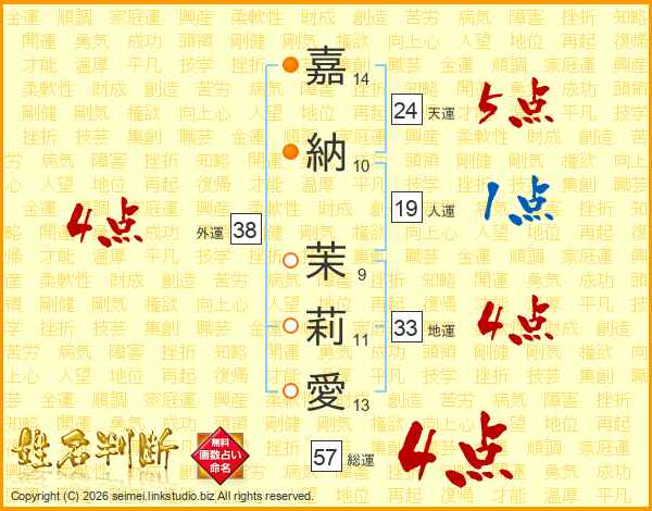 嘉(14画)納(10画) 茉(9画)莉(11画)愛(13画)