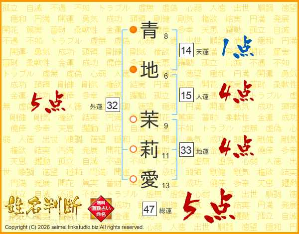 青(8画)地(6画) 茉(9画)莉(11画)愛(13画)