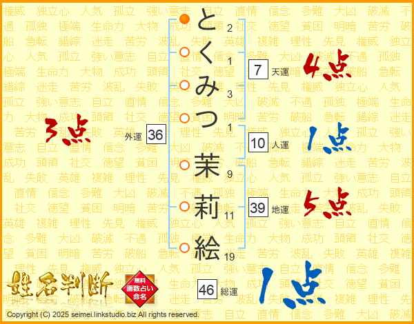 とくみつ茉莉絵さんの地運は39画の5点!