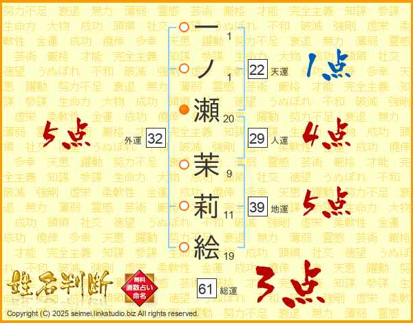 一ノ瀬茉莉絵さんの総運は61画の3点!